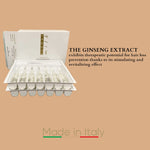 Each ampoule is enriched with natural ginseng milk extract, known for its stimulating and nourishing properties that help improve scalp circulation, reinforce hair roots, and encourage healthy hair regrowth.